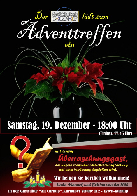 Auch in diesem Jahr lud der Geschichtskreis Carnap zu seinem traditionellem Adventtreffen am Samstag, 19.12.2015, 18:00 Uhr, in die Gaststätte Alt Carnap,, Karnaper Str. 112, 45329 Essen ein.